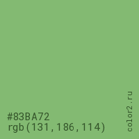 Цвет #83BA72 в цветовой модели RGB обозначается тремя октетами (131, 186, 114) в десятичном формате и #83BA72 в шестнадцатиричном (hex) формате, которые являются интенсивностью красного 131 (hex 83), интенсивность зелёного 186 (hex BA) и интенсивность синего 114 (hex 72).