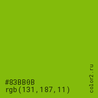 Цвет #83BB0B в цветовой модели RGB обозначается тремя октетами (131, 187, 11) в десятичном формате и #83BB0B в шестнадцатиричном (hex) формате, которые являются интенсивностью красного 131 (hex 83), интенсивность зелёного 187 (hex BB) и интенсивность синего 11 (hex 0B).