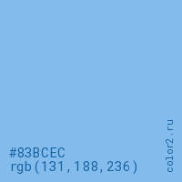 Цвет #83BCEC в цветовой модели RGB обозначается тремя октетами (131, 188, 236) в десятичном формате и #83BCEC в шестнадцатиричном (hex) формате, которые являются интенсивностью красного 131 (hex 83), интенсивность зелёного 188 (hex BC) и интенсивность синего 236 (hex EC).