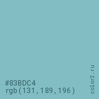 Цвет #83BDC4 в цветовой модели RGB обозначается тремя октетами (131, 189, 196) в десятичном формате и #83BDC4 в шестнадцатиричном (hex) формате, которые являются интенсивностью красного 131 (hex 83), интенсивность зелёного 189 (hex BD) и интенсивность синего 196 (hex C4).