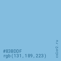 Цвет #83BDDF в цветовой модели RGB обозначается тремя октетами (131, 189, 223) в десятичном формате и #83BDDF в шестнадцатиричном (hex) формате, которые являются интенсивностью красного 131 (hex 83), интенсивность зелёного 189 (hex BD) и интенсивность синего 223 (hex DF).