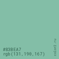 Цвет #83BEA7 в цветовой модели RGB обозначается тремя октетами (131, 190, 167) в десятичном формате и #83BEA7 в шестнадцатиричном (hex) формате, которые являются интенсивностью красного 131 (hex 83), интенсивность зелёного 190 (hex BE) и интенсивность синего 167 (hex A7).