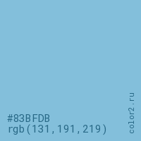 Цвет #83BFDB в цветовой модели RGB обозначается тремя октетами (131, 191, 219) в десятичном формате и #83BFDB в шестнадцатиричном (hex) формате, которые являются интенсивностью красного 131 (hex 83), интенсивность зелёного 191 (hex BF) и интенсивность синего 219 (hex DB).