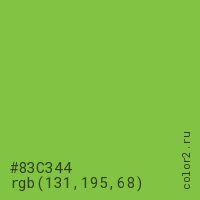 Цвет #83C344 в цветовой модели RGB обозначается тремя октетами (131, 195, 68) в десятичном формате и #83C344 в шестнадцатиричном (hex) формате, которые являются интенсивностью красного 131 (hex 83), интенсивность зелёного 195 (hex C3) и интенсивность синего 68 (hex 44).