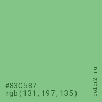 Цвет #83C587 в цветовой модели RGB обозначается тремя октетами (131, 197, 135) в десятичном формате и #83C587 в шестнадцатиричном (hex) формате, которые являются интенсивностью красного 131 (hex 83), интенсивность зелёного 197 (hex C5) и интенсивность синего 135 (hex 87).