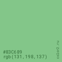 Цвет #83C689 в цветовой модели RGB обозначается тремя октетами (131, 198, 137) в десятичном формате и #83C689 в шестнадцатиричном (hex) формате, которые являются интенсивностью красного 131 (hex 83), интенсивность зелёного 198 (hex C6) и интенсивность синего 137 (hex 89).