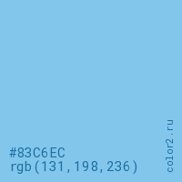 Цвет #83C6EC в цветовой модели RGB обозначается тремя октетами (131, 198, 236) в десятичном формате и #83C6EC в шестнадцатиричном (hex) формате, которые являются интенсивностью красного 131 (hex 83), интенсивность зелёного 198 (hex C6) и интенсивность синего 236 (hex EC).