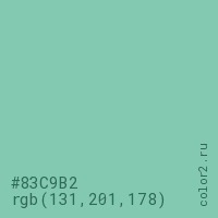 Цвет #83C9B2 в цветовой модели RGB обозначается тремя октетами (131, 201, 178) в десятичном формате и #83C9B2 в шестнадцатиричном (hex) формате, которые являются интенсивностью красного 131 (hex 83), интенсивность зелёного 201 (hex C9) и интенсивность синего 178 (hex B2).