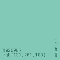 Цвет #83C9B7 в цветовой модели RGB обозначается тремя октетами (131, 201, 183) в десятичном формате и #83C9B7 в шестнадцатиричном (hex) формате, которые являются интенсивностью красного 131 (hex 83), интенсивность зелёного 201 (hex C9) и интенсивность синего 183 (hex B7).