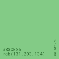 Цвет #83CB86 в цветовой модели RGB обозначается тремя октетами (131, 203, 134) в десятичном формате и #83CB86 в шестнадцатиричном (hex) формате, которые являются интенсивностью красного 131 (hex 83), интенсивность зелёного 203 (hex CB) и интенсивность синего 134 (hex 86).