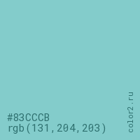 Цвет #83CCCB в цветовой модели RGB обозначается тремя октетами (131, 204, 203) в десятичном формате и #83CCCB в шестнадцатиричном (hex) формате, которые являются интенсивностью красного 131 (hex 83), интенсивность зелёного 204 (hex CC) и интенсивность синего 203 (hex CB).
