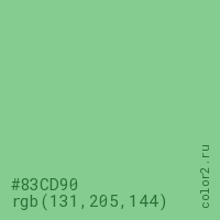 Цвет #83CD90 в цветовой модели RGB обозначается тремя октетами (131, 205, 144) в десятичном формате и #83CD90 в шестнадцатиричном (hex) формате, которые являются интенсивностью красного 131 (hex 83), интенсивность зелёного 205 (hex CD) и интенсивность синего 144 (hex 90).