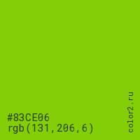 Цвет #83CE06 в цветовой модели RGB обозначается тремя октетами (131, 206, 6) в десятичном формате и #83CE06 в шестнадцатиричном (hex) формате, которые являются интенсивностью красного 131 (hex 83), интенсивность зелёного 206 (hex CE) и интенсивность синего 6 (hex 06).