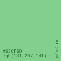 Цвет #83CF8D в цветовой модели RGB обозначается тремя октетами (131, 207, 141) в десятичном формате и #83CF8D в шестнадцатиричном (hex) формате, которые являются интенсивностью красного 131 (hex 83), интенсивность зелёного 207 (hex CF) и интенсивность синего 141 (hex 8D).