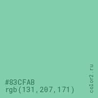 Цвет #83CFAB в цветовой модели RGB обозначается тремя октетами (131, 207, 171) в десятичном формате и #83CFAB в шестнадцатиричном (hex) формате, которые являются интенсивностью красного 131 (hex 83), интенсивность зелёного 207 (hex CF) и интенсивность синего 171 (hex AB).