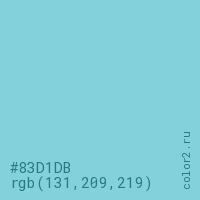Цвет #83D1DB в цветовой модели RGB обозначается тремя октетами (131, 209, 219) в десятичном формате и #83D1DB в шестнадцатиричном (hex) формате, которые являются интенсивностью красного 131 (hex 83), интенсивность зелёного 209 (hex D1) и интенсивность синего 219 (hex DB).