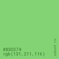 Цвет #83D374 в цветовой модели RGB обозначается тремя октетами (131, 211, 116) в десятичном формате и #83D374 в шестнадцатиричном (hex) формате, которые являются интенсивностью красного 131 (hex 83), интенсивность зелёного 211 (hex D3) и интенсивность синего 116 (hex 74).
