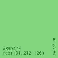 Цвет #83D47E в цветовой модели RGB обозначается тремя октетами (131, 212, 126) в десятичном формате и #83D47E в шестнадцатиричном (hex) формате, которые являются интенсивностью красного 131 (hex 83), интенсивность зелёного 212 (hex D4) и интенсивность синего 126 (hex 7E).