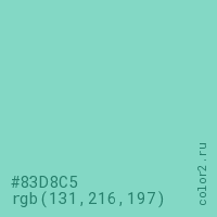 Цвет #83D8C5 в цветовой модели RGB обозначается тремя октетами (131, 216, 197) в десятичном формате и #83D8C5 в шестнадцатиричном (hex) формате, которые являются интенсивностью красного 131 (hex 83), интенсивность зелёного 216 (hex D8) и интенсивность синего 197 (hex C5).