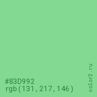 Цвет #83D992 в цветовой модели RGB обозначается тремя октетами (131, 217, 146) в десятичном формате и #83D992 в шестнадцатиричном (hex) формате, которые являются интенсивностью красного 131 (hex 83), интенсивность зелёного 217 (hex D9) и интенсивность синего 146 (hex 92).