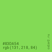 Цвет #83DA54 в цветовой модели RGB обозначается тремя октетами (131, 218, 84) в десятичном формате и #83DA54 в шестнадцатиричном (hex) формате, которые являются интенсивностью красного 131 (hex 83), интенсивность зелёного 218 (hex DA) и интенсивность синего 84 (hex 54).