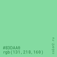 Цвет #83DAA0 в цветовой модели RGB обозначается тремя октетами (131, 218, 160) в десятичном формате и #83DAA0 в шестнадцатиричном (hex) формате, которые являются интенсивностью красного 131 (hex 83), интенсивность зелёного 218 (hex DA) и интенсивность синего 160 (hex A0).