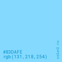 Цвет #83DAFE в цветовой модели RGB обозначается тремя октетами (131, 218, 254) в десятичном формате и #83DAFE в шестнадцатиричном (hex) формате, которые являются интенсивностью красного 131 (hex 83), интенсивность зелёного 218 (hex DA) и интенсивность синего 254 (hex FE).