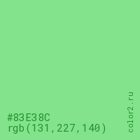 Цвет #83E38C в цветовой модели RGB обозначается тремя октетами (131, 227, 140) в десятичном формате и #83E38C в шестнадцатиричном (hex) формате, которые являются интенсивностью красного 131 (hex 83), интенсивность зелёного 227 (hex E3) и интенсивность синего 140 (hex 8C).