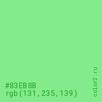Цвет #83EB8B в цветовой модели RGB обозначается тремя октетами (131, 235, 139) в десятичном формате и #83EB8B в шестнадцатиричном (hex) формате, которые являются интенсивностью красного 131 (hex 83), интенсивность зелёного 235 (hex EB) и интенсивность синего 139 (hex 8B).