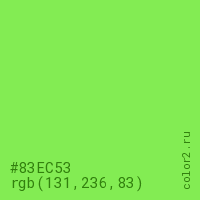 Цвет #83EC53 в цветовой модели RGB обозначается тремя октетами (131, 236, 83) в десятичном формате и #83EC53 в шестнадцатиричном (hex) формате, которые являются интенсивностью красного 131 (hex 83), интенсивность зелёного 236 (hex EC) и интенсивность синего 83 (hex 53).