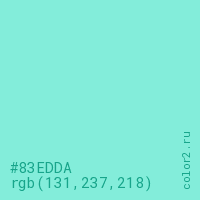 Цвет #83EDDA в цветовой модели RGB обозначается тремя октетами (131, 237, 218) в десятичном формате и #83EDDA в шестнадцатиричном (hex) формате, которые являются интенсивностью красного 131 (hex 83), интенсивность зелёного 237 (hex ED) и интенсивность синего 218 (hex DA).