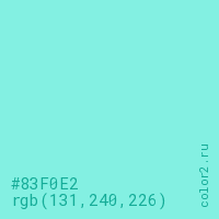 Цвет #83F0E2 в цветовой модели RGB обозначается тремя октетами (131, 240, 226) в десятичном формате и #83F0E2 в шестнадцатиричном (hex) формате, которые являются интенсивностью красного 131 (hex 83), интенсивность зелёного 240 (hex F0) и интенсивность синего 226 (hex E2).