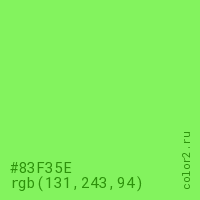 Цвет #83F35E в цветовой модели RGB обозначается тремя октетами (131, 243, 94) в десятичном формате и #83F35E в шестнадцатиричном (hex) формате, которые являются интенсивностью красного 131 (hex 83), интенсивность зелёного 243 (hex F3) и интенсивность синего 94 (hex 5E).
