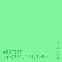 Цвет #83F39F в цветовой модели RGB обозначается тремя октетами (131, 243, 159) в десятичном формате и #83F39F в шестнадцатиричном (hex) формате, которые являются интенсивностью красного 131 (hex 83), интенсивность зелёного 243 (hex F3) и интенсивность синего 159 (hex 9F).