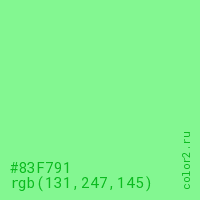 Цвет #83F791 в цветовой модели RGB обозначается тремя октетами (131, 247, 145) в десятичном формате и #83F791 в шестнадцатиричном (hex) формате, которые являются интенсивностью красного 131 (hex 83), интенсивность зелёного 247 (hex F7) и интенсивность синего 145 (hex 91).