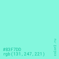 Цвет #83F7DD в цветовой модели RGB обозначается тремя октетами (131, 247, 221) в десятичном формате и #83F7DD в шестнадцатиричном (hex) формате, которые являются интенсивностью красного 131 (hex 83), интенсивность зелёного 247 (hex F7) и интенсивность синего 221 (hex DD).