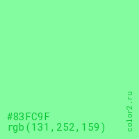 Цвет #83FC9F в цветовой модели RGB обозначается тремя октетами (131, 252, 159) в десятичном формате и #83FC9F в шестнадцатиричном (hex) формате, которые являются интенсивностью красного 131 (hex 83), интенсивность зелёного 252 (hex FC) и интенсивность синего 159 (hex 9F).