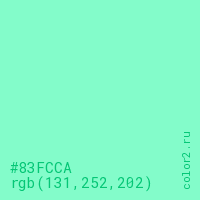 Цвет #83FCCA в цветовой модели RGB обозначается тремя октетами (131, 252, 202) в десятичном формате и #83FCCA в шестнадцатиричном (hex) формате, которые являются интенсивностью красного 131 (hex 83), интенсивность зелёного 252 (hex FC) и интенсивность синего 202 (hex CA).