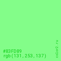 Цвет #83FD89 в цветовой модели RGB обозначается тремя октетами (131, 253, 137) в десятичном формате и #83FD89 в шестнадцатиричном (hex) формате, которые являются интенсивностью красного 131 (hex 83), интенсивность зелёного 253 (hex FD) и интенсивность синего 137 (hex 89).