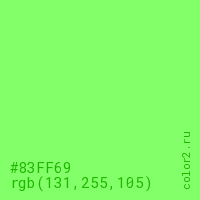 Цвет #83FF69 в цветовой модели RGB обозначается тремя октетами (131, 255, 105) в десятичном формате и #83FF69 в шестнадцатиричном (hex) формате, которые являются интенсивностью красного 131 (hex 83), интенсивность зелёного 255 (hex FF) и интенсивность синего 105 (hex 69).