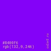 Цвет #8400F6 в цветовой модели RGB обозначается тремя октетами (132, 0, 246) в десятичном формате и #8400F6 в шестнадцатиричном (hex) формате, которые являются интенсивностью красного 132 (hex 84), интенсивность зелёного 0 (hex 00) и интенсивность синего 246 (hex F6).