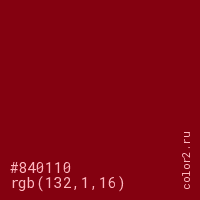 Цвет #840110 в цветовой модели RGB обозначается тремя октетами (132, 1, 16) в десятичном формате и #840110 в шестнадцатиричном (hex) формате, которые являются интенсивностью красного 132 (hex 84), интенсивность зелёного 1 (hex 01) и интенсивность синего 16 (hex 10).