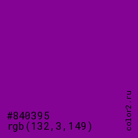Цвет #840395 в цветовой модели RGB обозначается тремя октетами (132, 3, 149) в десятичном формате и #840395 в шестнадцатиричном (hex) формате, которые являются интенсивностью красного 132 (hex 84), интенсивность зелёного 3 (hex 03) и интенсивность синего 149 (hex 95).