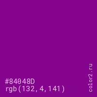 Цвет #84048D в цветовой модели RGB обозначается тремя октетами (132, 4, 141) в десятичном формате и #84048D в шестнадцатиричном (hex) формате, которые являются интенсивностью красного 132 (hex 84), интенсивность зелёного 4 (hex 04) и интенсивность синего 141 (hex 8D).