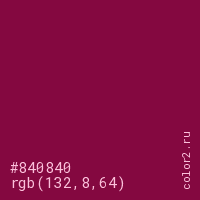 Цвет #840840 в цветовой модели RGB обозначается тремя октетами (132, 8, 64) в десятичном формате и #840840 в шестнадцатиричном (hex) формате, которые являются интенсивностью красного 132 (hex 84), интенсивность зелёного 8 (hex 08) и интенсивность синего 64 (hex 40).