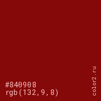 Цвет #840908 в цветовой модели RGB обозначается тремя октетами (132, 9, 8) в десятичном формате и #840908 в шестнадцатиричном (hex) формате, которые являются интенсивностью красного 132 (hex 84), интенсивность зелёного 9 (hex 09) и интенсивность синего 8 (hex 08).