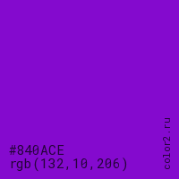 Цвет #840ACE в цветовой модели RGB обозначается тремя октетами (132, 10, 206) в десятичном формате и #840ACE в шестнадцатиричном (hex) формате, которые являются интенсивностью красного 132 (hex 84), интенсивность зелёного 10 (hex 0A) и интенсивность синего 206 (hex CE).