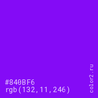 Цвет #840BF6 в цветовой модели RGB обозначается тремя октетами (132, 11, 246) в десятичном формате и #840BF6 в шестнадцатиричном (hex) формате, которые являются интенсивностью красного 132 (hex 84), интенсивность зелёного 11 (hex 0B) и интенсивность синего 246 (hex F6).