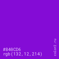 Цвет #840CD6 в цветовой модели RGB обозначается тремя октетами (132, 12, 214) в десятичном формате и #840CD6 в шестнадцатиричном (hex) формате, которые являются интенсивностью красного 132 (hex 84), интенсивность зелёного 12 (hex 0C) и интенсивность синего 214 (hex D6).