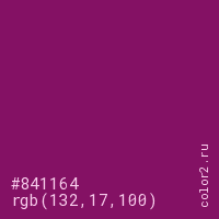 Цвет #841164 в цветовой модели RGB обозначается тремя октетами (132, 17, 100) в десятичном формате и #841164 в шестнадцатиричном (hex) формате, которые являются интенсивностью красного 132 (hex 84), интенсивность зелёного 17 (hex 11) и интенсивность синего 100 (hex 64).